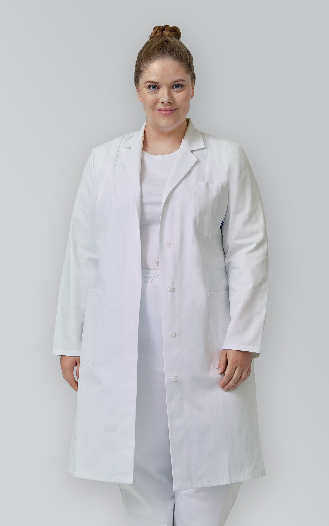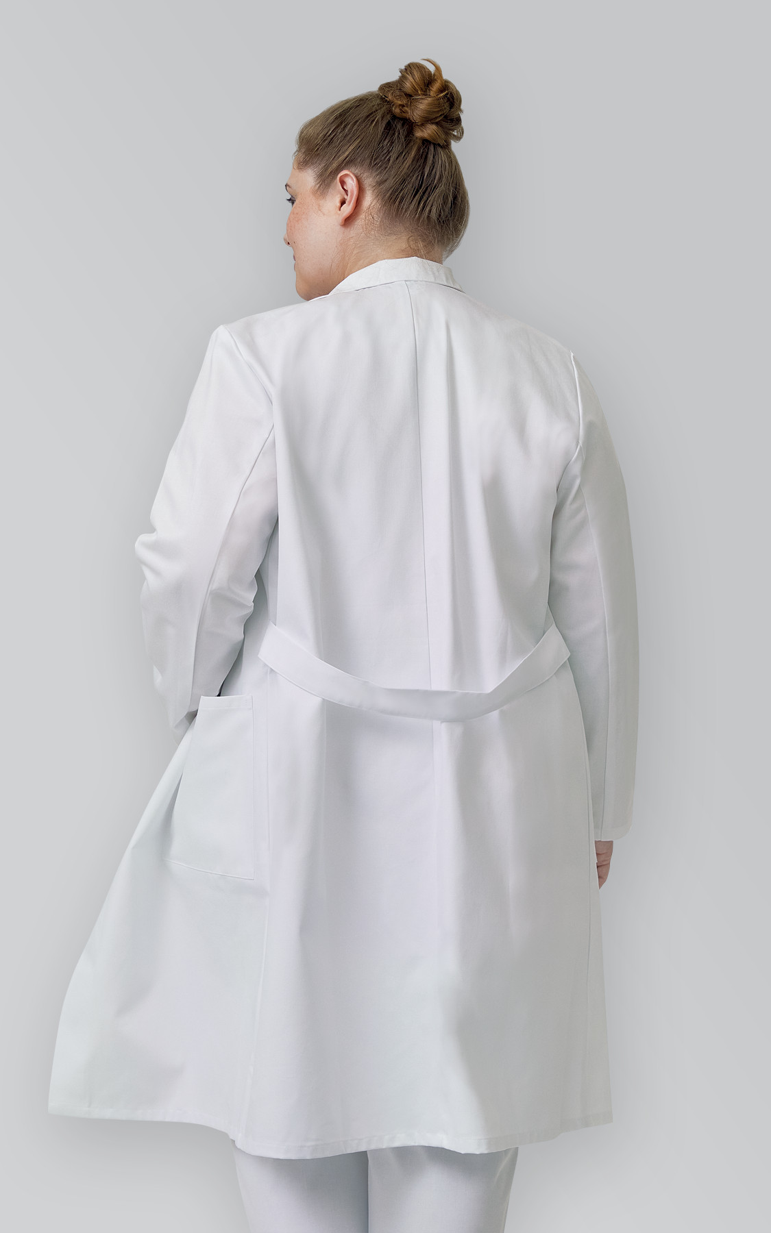 Dámský laboratorní a lékařský plášť rovného, volného střihu. Vpředu dvě prostorné spodní kapsy a jedna menší náprsní kapsa. S ozdobným dragounem v oblasti zad a s dlouhými rukávy. Zapínání je na 5 nitěných knoflíků.