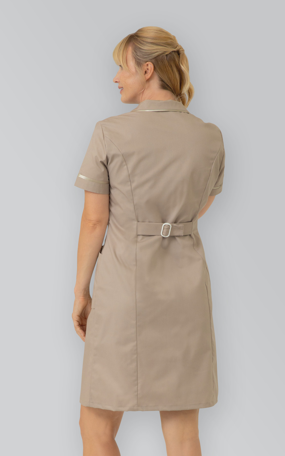 Dámské tvarované zdravotnické šaty s projmutím v pase. Vpředu jsou členěny princesovým švem, v oblasti zad je efektní pásek, ke stažení v pase. Krátké rukávy a kulatý límeček jsou lemovány ozdobným saténovým prýmkem ve stejném tónu jako barva šatů. Vpředu se dvěma prostornými kapsami, jednou menší boční kapsou a jednou náprsní kapsou. Zapínání je skryté na 5 kovových druků, šaty nejsou celopropínací.