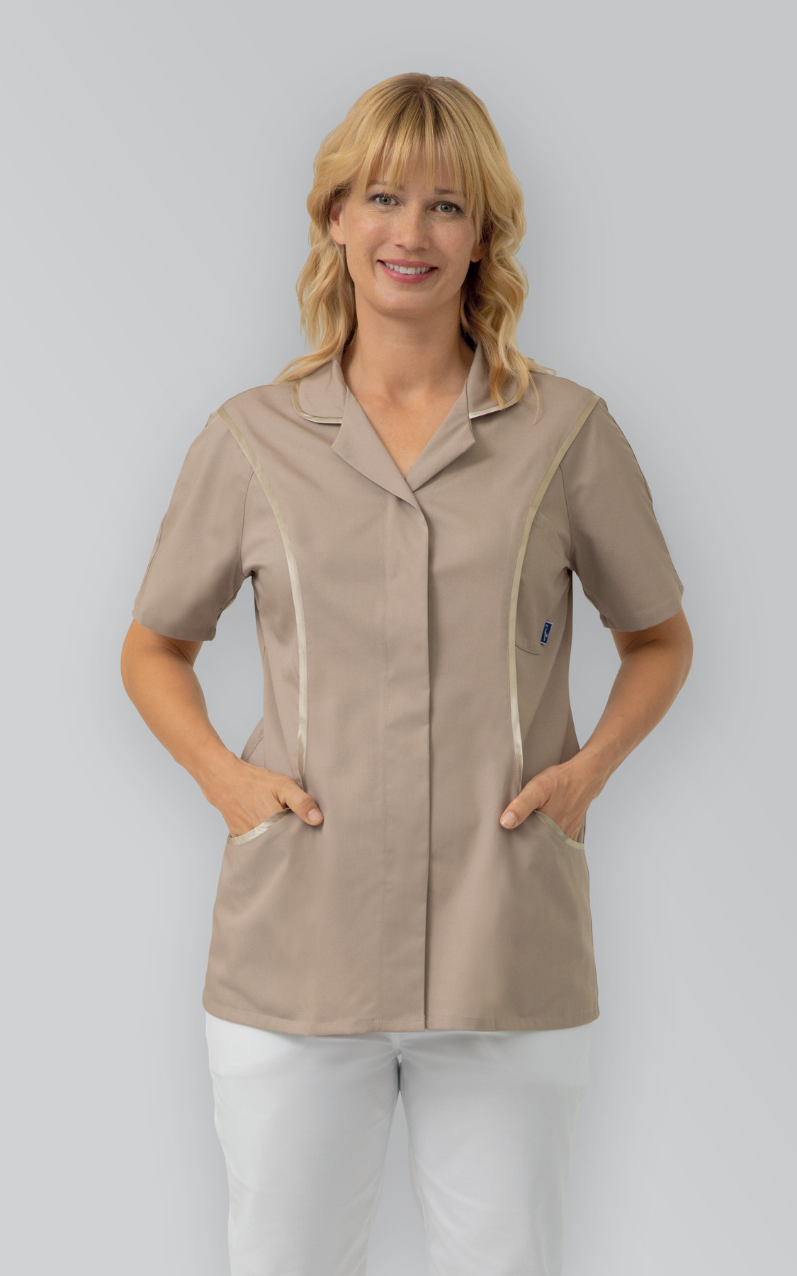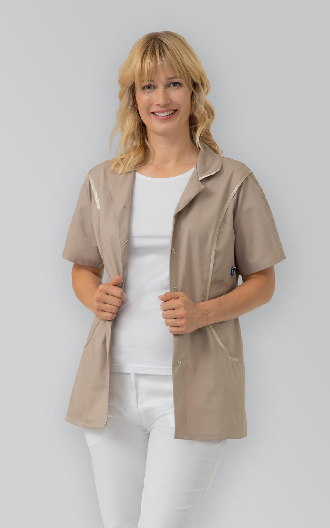 Dámská tvarovaná zdravotnická halena s projmutím v pase. Vpředu je členěna princesovým švem, který je stejně jako kulatý límeček zdobený saténovým prýmkem ve stejném tónu jako barva haleny. Záda jsou projmuta středovým švem. Rukávy jsou krátké, raglánové. Vpředu jsou dvě spodní prostorné kapsy a jedna menší náprsní kapsa. Zapínání je skryté na 5 kovových druků.