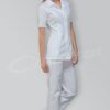 Krátka sukňa do pásu, so strihom do tvaru A. Predný diel ozdobne členený a prešívaný. V zadnej časti pásu guma pre pohodlnejšie nosenie. Vpredu dve vnútorné vrecká, ozdobne prešité. Zapínanie je vzadu, stredom na plastový zips a jeden plastový gombík.